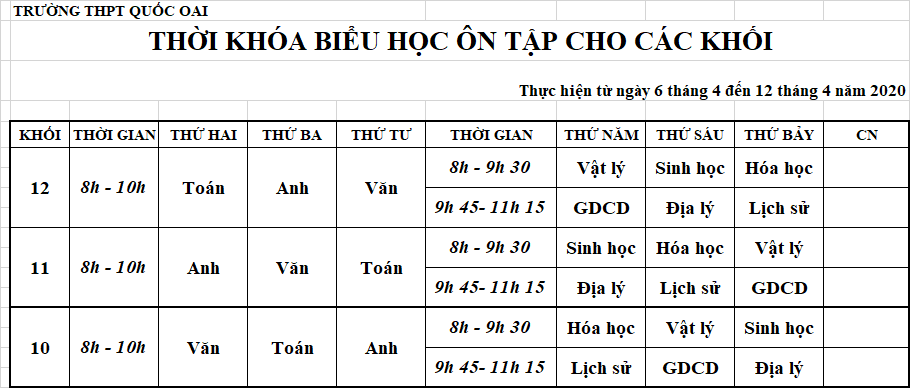 2. Các em Học sinh ôn tập theo thời khóa biểu dưới đây để tránh trùng lặp các thời gian học trực tuyến cũng như ôn tập lại nội dung đã học.