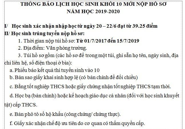 THÔNG BÁO LỊCH HỌC SINH KHỐI 10 MỚI NỘP HỒ SƠ